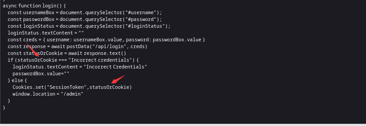 我们注意到一个login.js文件,他对登陆的认证是如果statusOrCookie的值是Incorrect,那就不能登陆,如果成功,那就将SessionToken设置为“statusOrCookie”,那就试着自己伪造一个SessionToken