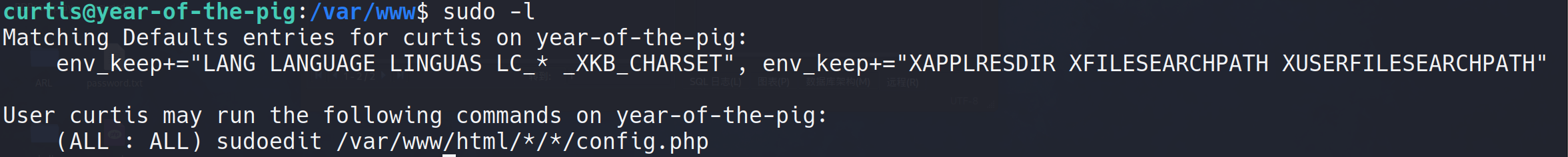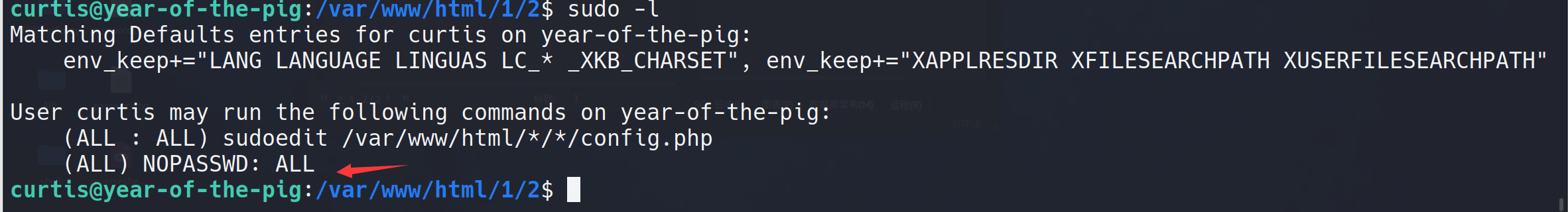 可以用sudoedit来编辑这个目录下的config.php,一般是用这权限来编辑任意文件,我们可以利用来添加用户至/etc/sudoers来达到提权的目的