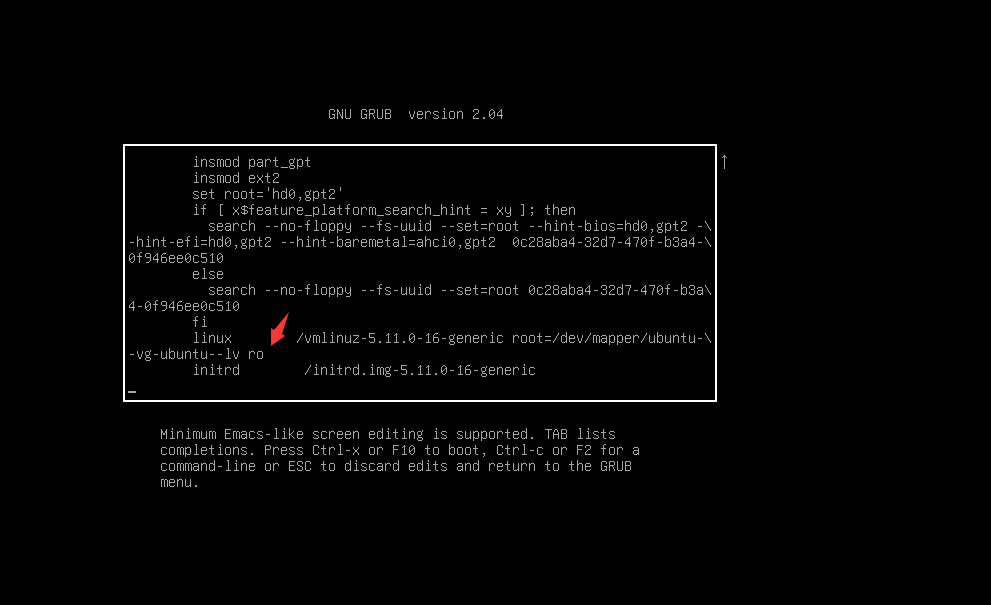 在最后一行,将”ro”或者”ro quite”改成rw signie init=/bin/bash。改完之后按Ctrl+x键进入bash