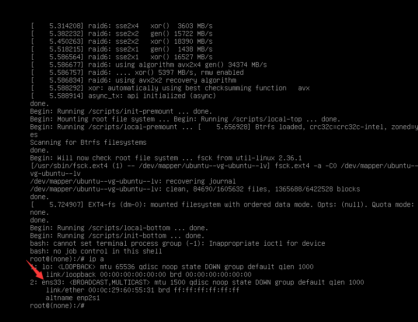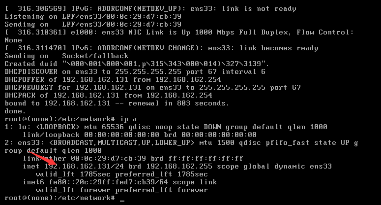 输入ip a查看网卡,看到物理网卡是ens33,并且没有分配到IP。