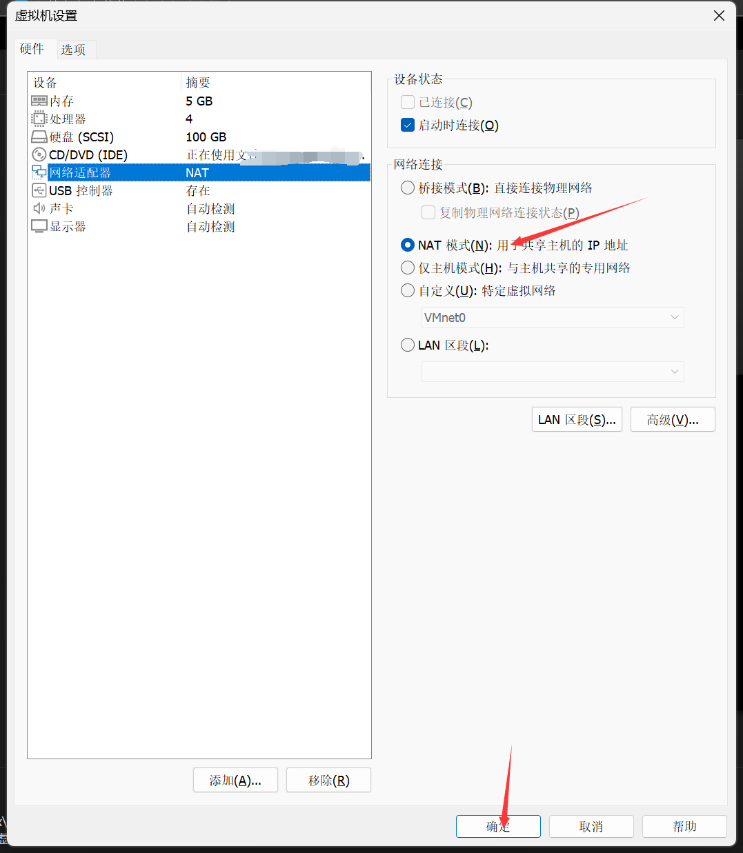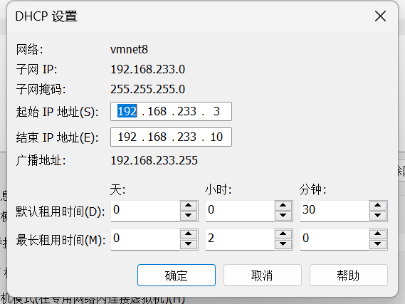 这里确定虚拟机IP的C段,我选用的是3->10,根据自己的虚拟机数量确定分配的IP数量,然后右下角确定