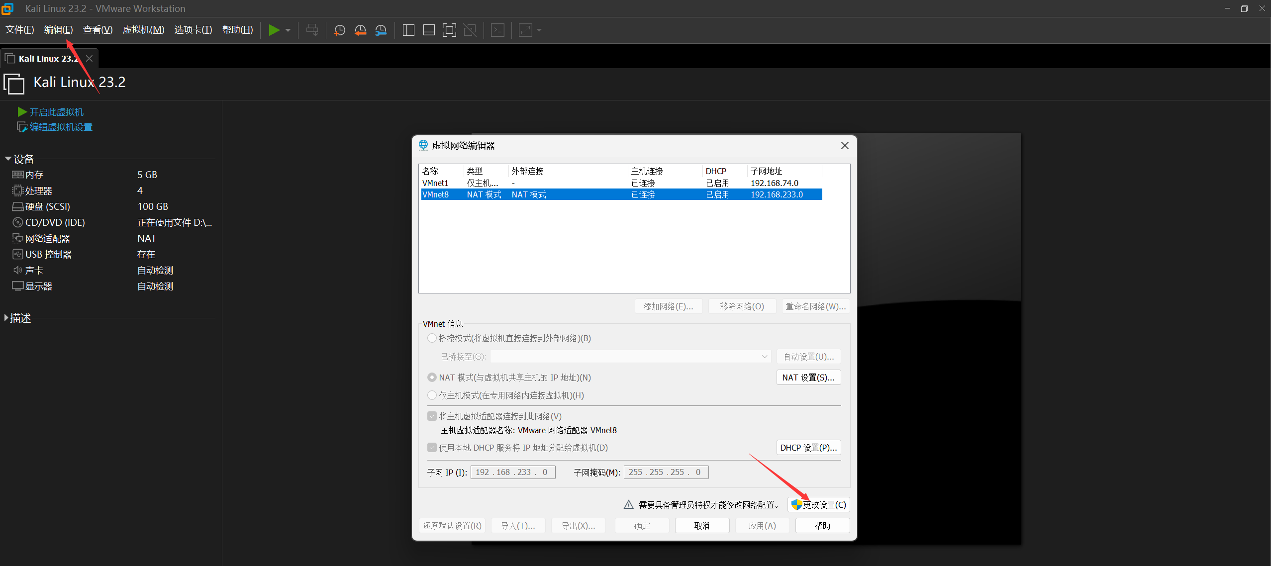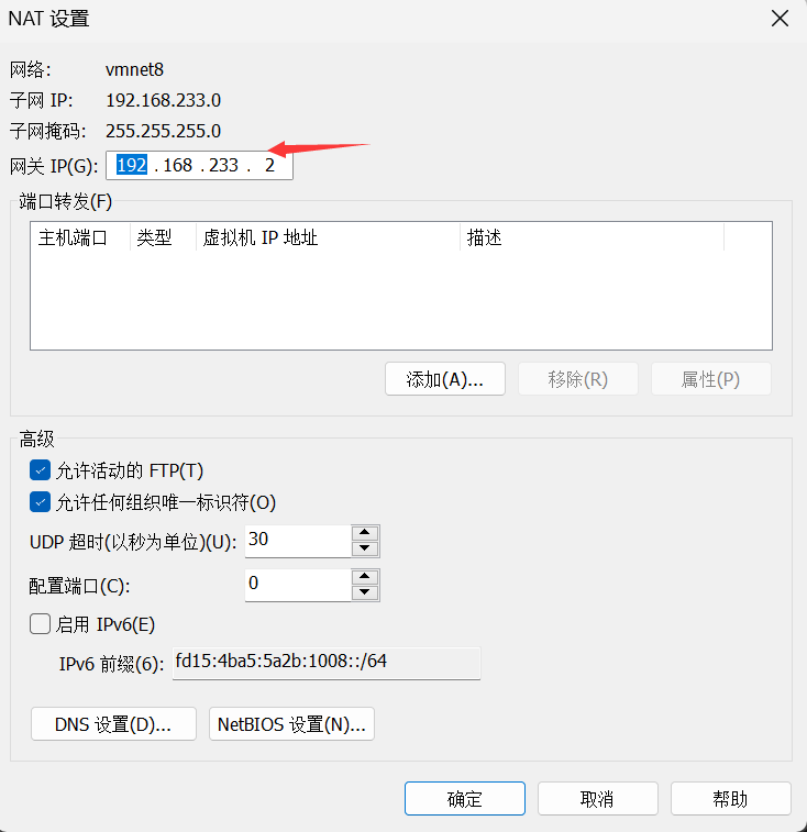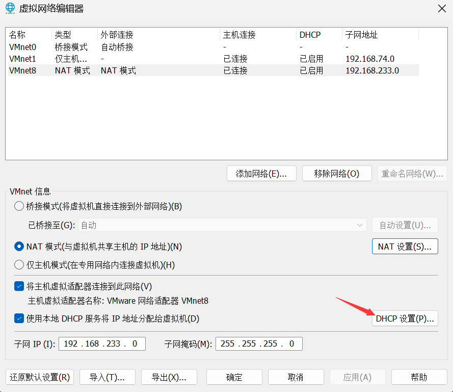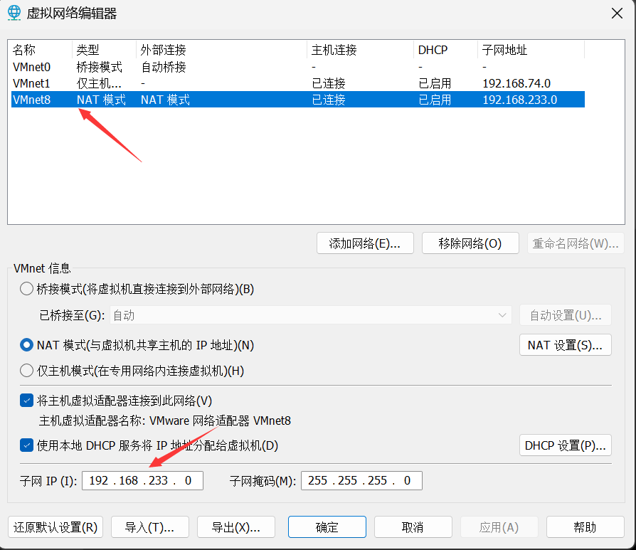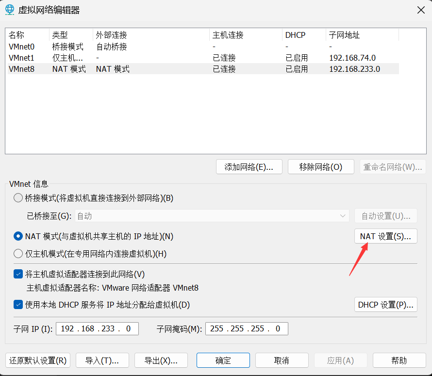 选用VMnet8这张网卡,子网IP设置为192.168.xxx.0,“xxx”自己随便取一个,我这里采用233