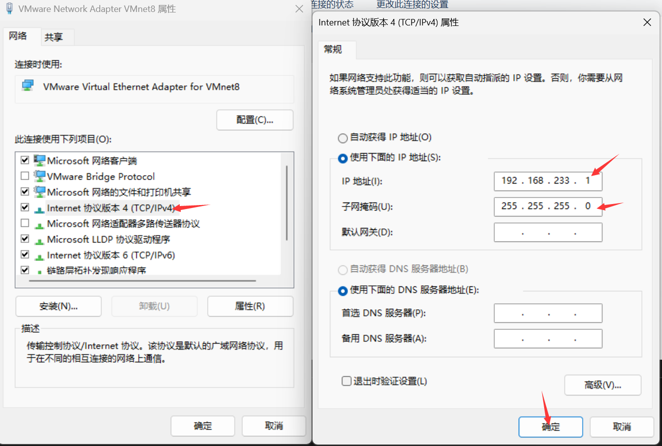 双击IPv4,然后手动设置物理机的IP,注意,不要和之前设置的网关IP和虚拟机的IP网段冲突,我这里设置为1,然后右下角确定。